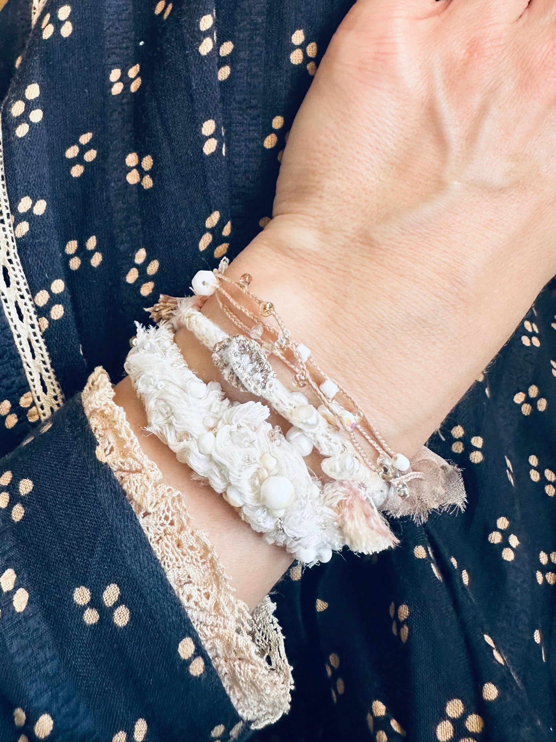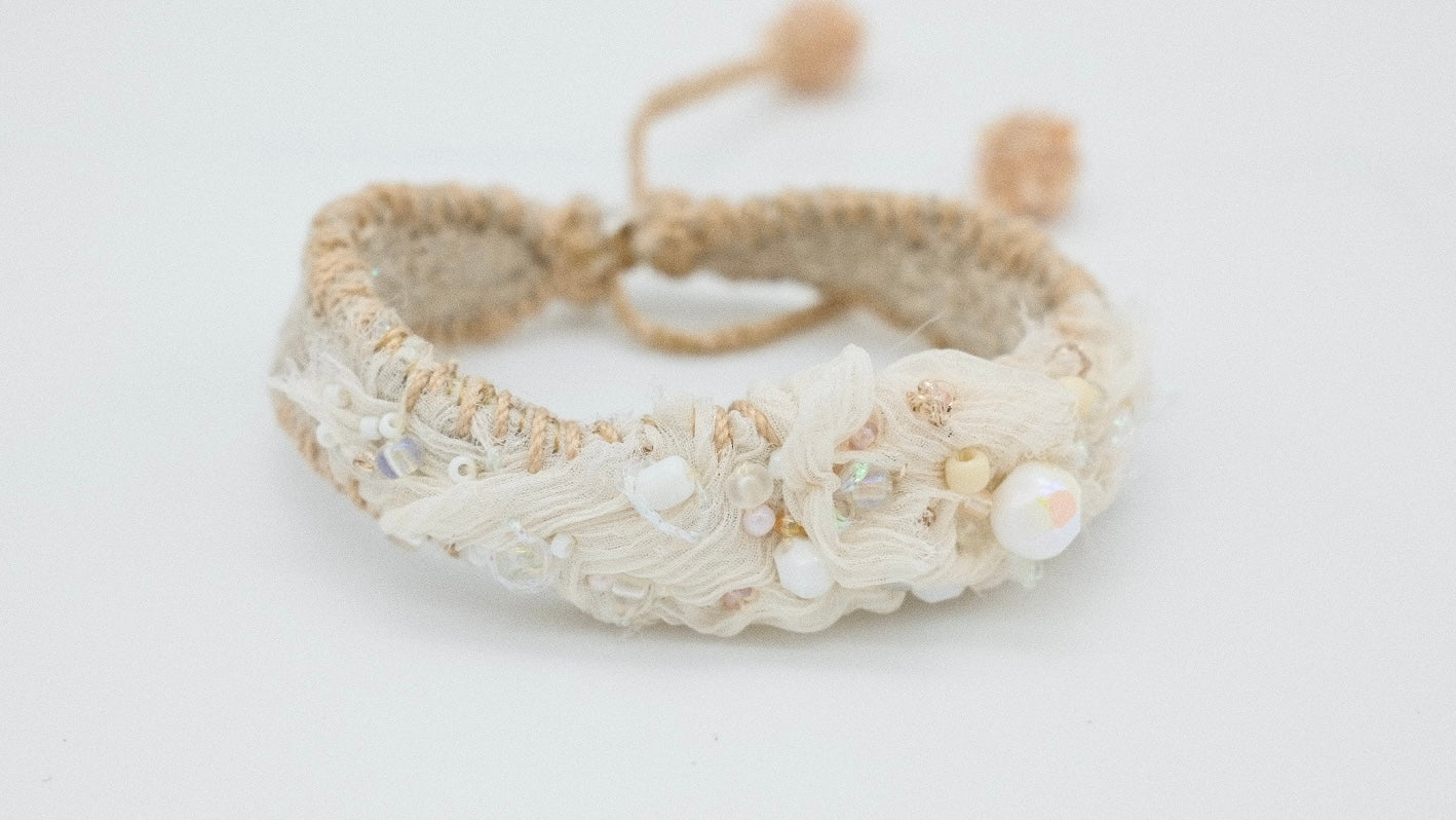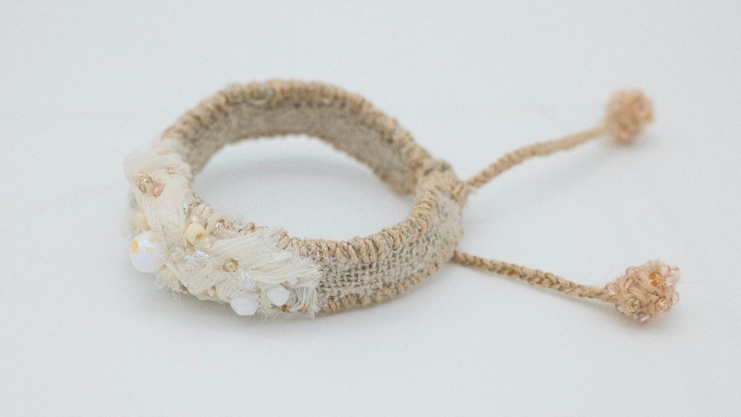 Unikatowa bransoletka to połączenie rzemiosła, natury i elegancji, której nie znajdziesz nigdzie indziej. Każda bransoletka została wykonana ręcznie z najwyższej jakości naturalnych materiałów, takich jak len, wełna, jedwab, aksamit, kamienie szlachetne, szklane koraliki, nici jedwabne oraz sznurki i inne nici, co nadaje im niepowtarzalny charakter.