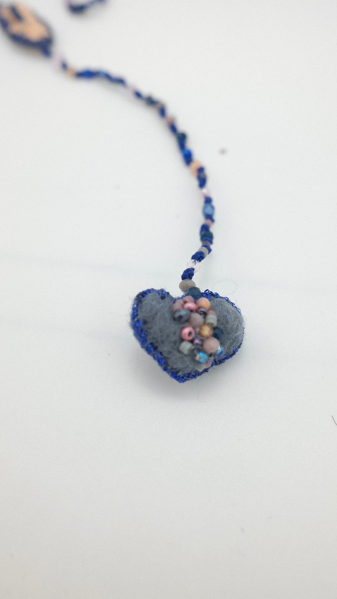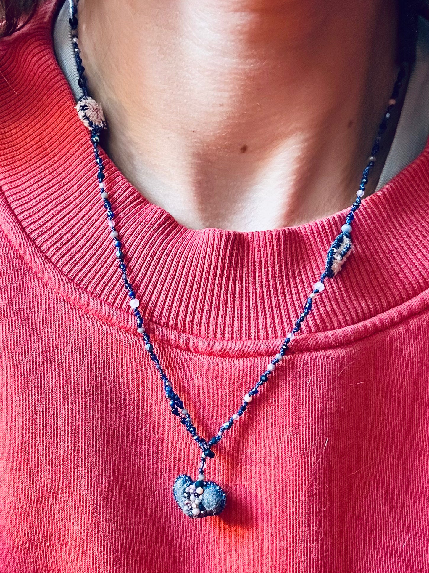 Ten naszyjnik na jedwabnej nitce to coś więcej niż zwykła biżuteria – to małe dzieło sztuki, stworzone z sercem. szkalne korliki dodają mu subtelnego blasku i energii. Zawieszka w kształcie serca, wykonana z wełny czesanej, zachwyca swoją miękkością i lekkością, a umieszczone na niej szklane koraliki dodają jej delikatnego połysku. Każdy detal ręcznych zdobień opowiada historię i nadaje naszyjnikowi niepowtarzalny charakter. Dzięki regulowanej długości możesz nosić go tak, jak lubisz – blisko szyi lub luźniej, w zależności od nastroju czy stylizacji. To idealny dodatek, który wprowadza magię zarówno do codziennych, jak i wyjątkowych momentów. Stworzony z pasją dla osób ceniących unikatowe, ręcznie robione przedmioty pełne duszy.