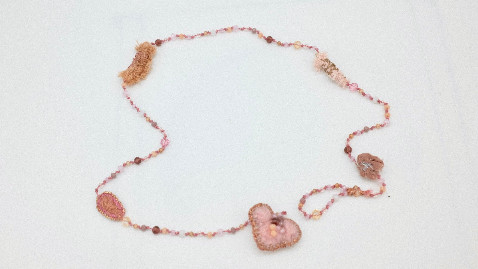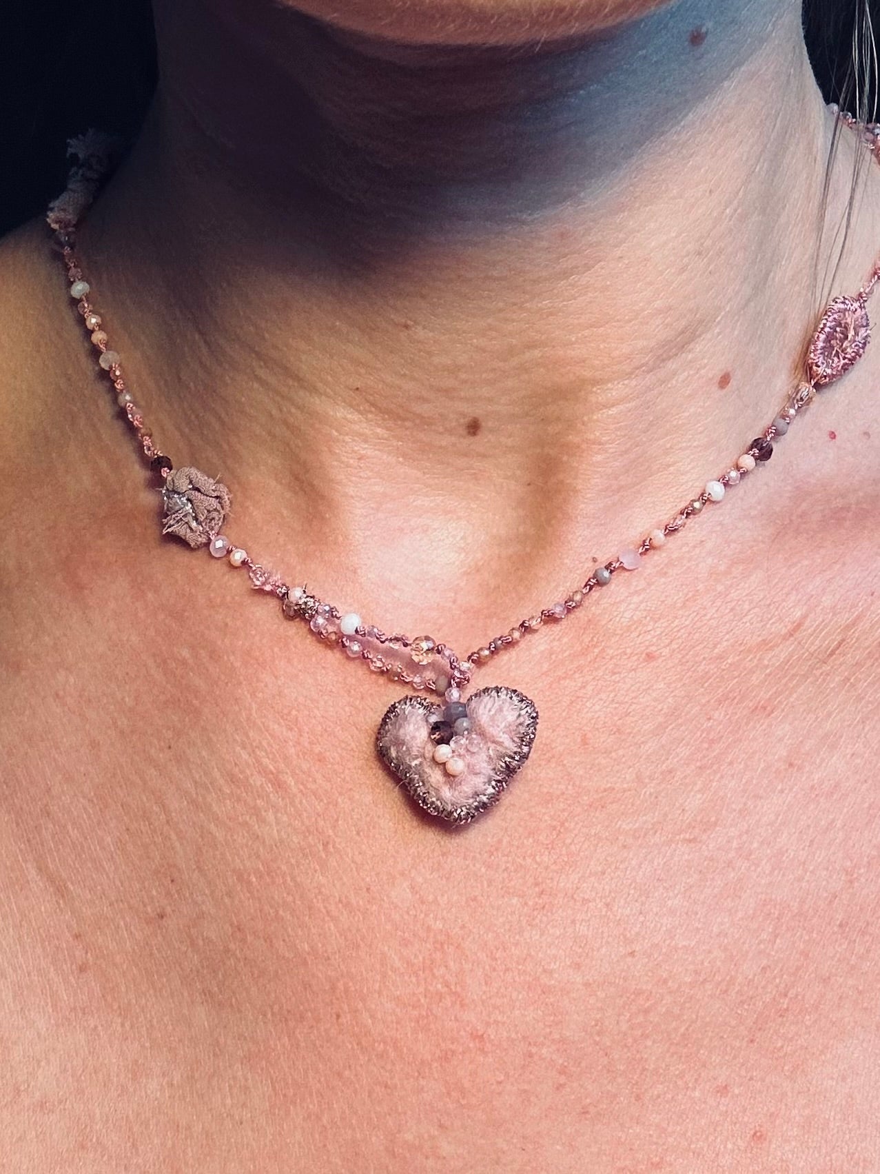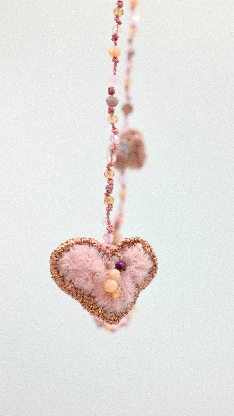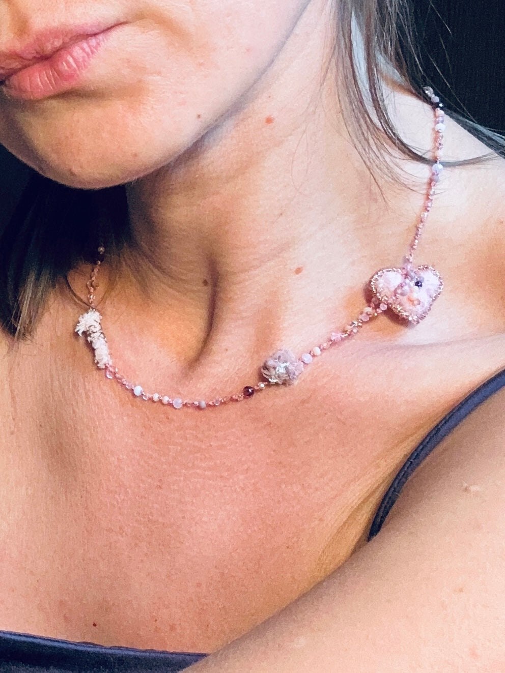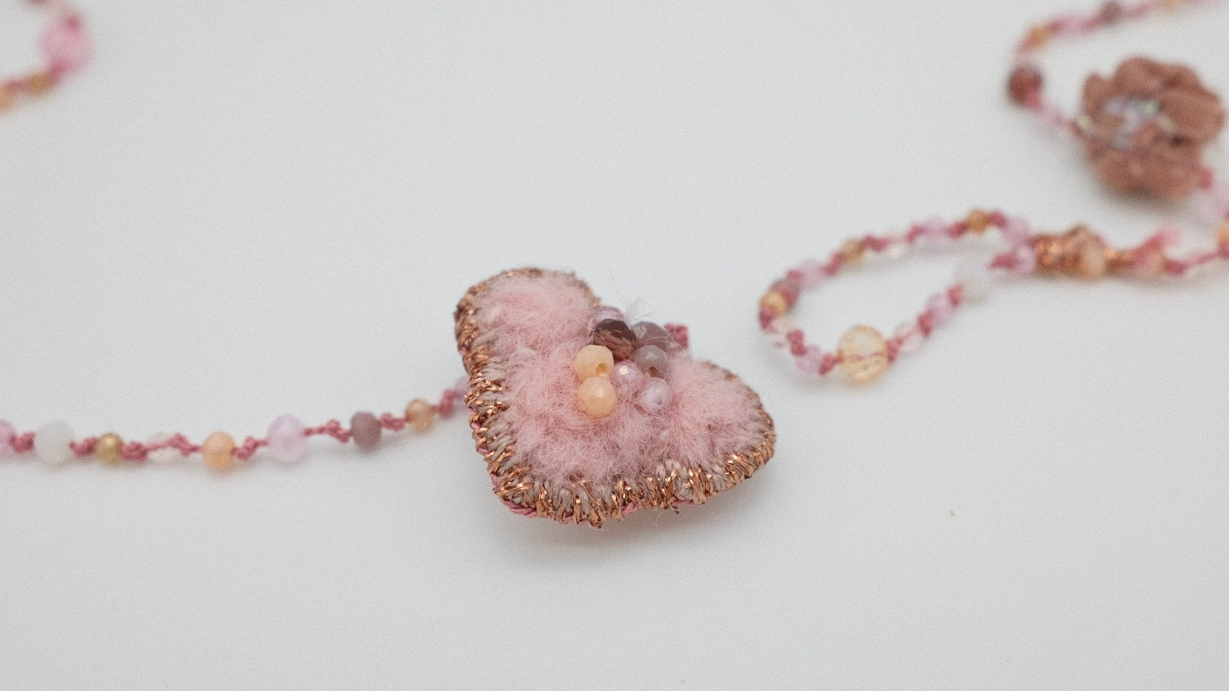Ten naszyjnik na jedwabnej nitce to coś więcej niż zwykła biżuteria – to małe dzieło sztuki, stworzone z sercem. Naturalne kamienie, takie jak kwarc rubinowy i kwarc różowy, dodają mu subtelnego blasku i energii. Zawieszka w kształcie serca, wykonana z wełny czesanej, zachwyca swoją miękkością i lekkością, a umieszczone na niej szklane koraliki dodają jej delikatnego połysku. Każdy detal ręcznych zdobień opowiada historię i nadaje naszyjnikowi niepowtarzalny charakter. Dzięki regulowanej długości możesz nosić go tak, jak lubisz – blisko szyi lub luźniej, w zależności od nastroju czy stylizacji. To idealny dodatek, który wprowadza magię zarówno do codziennych, jak i wyjątkowych momentów. Stworzony z pasją dla osób ceniących unikatowe, ręcznie robione przedmioty pełne duszy.